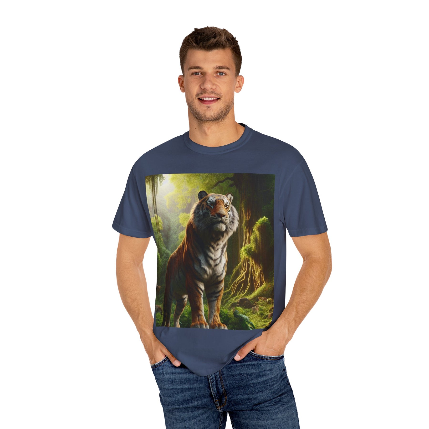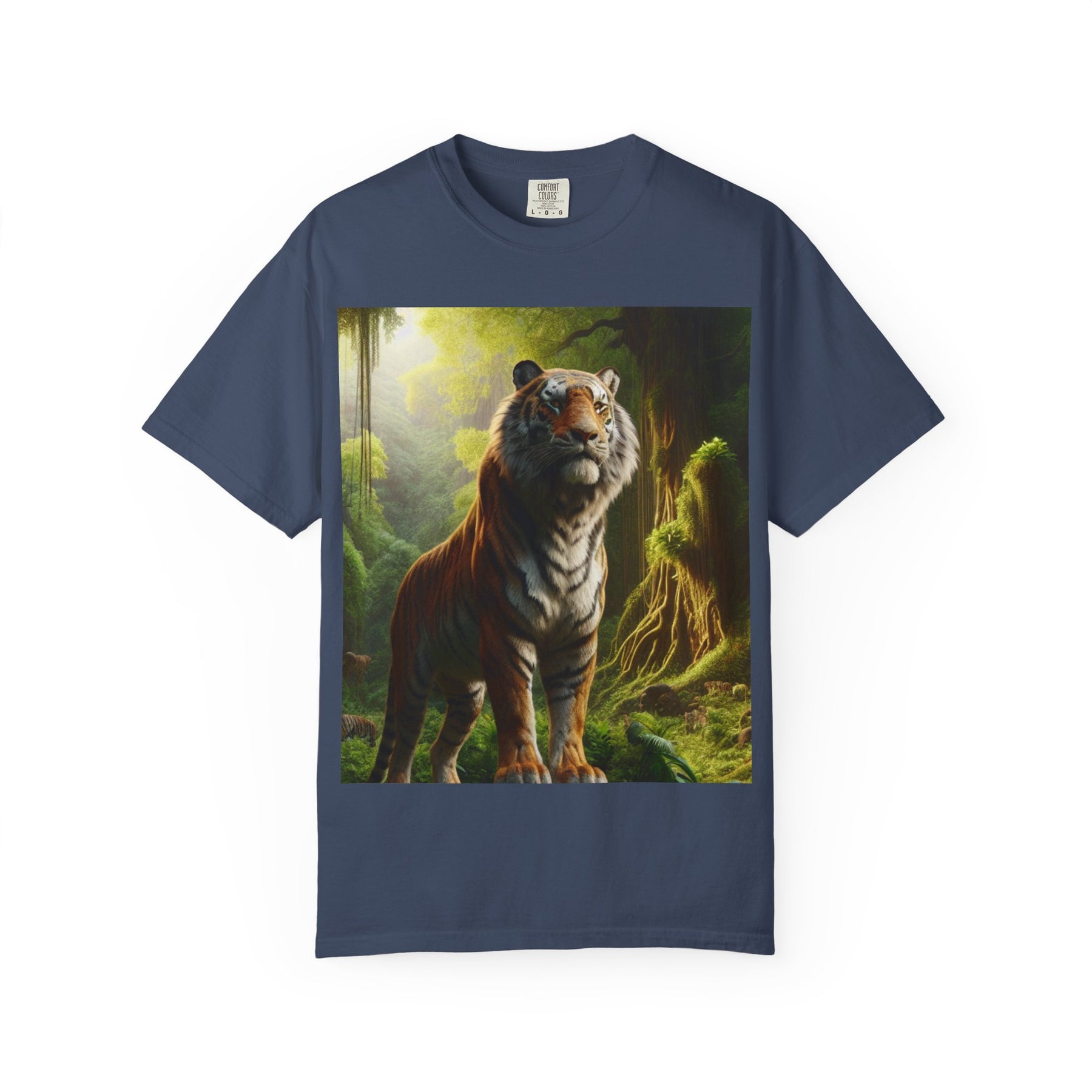 Introducing our premium Unisex Garment-Dyed T-shirt, the perfect blend of style and comfort. This shirt features a stunning design of a majestic tiger in its natural habitat, making it a great conversation starter and a bold fashion statement. Perfect for animal lovers and those who appreciate unique artistry, this T-shirt effortlessly complements both casual outings and semi-formal gatherings.